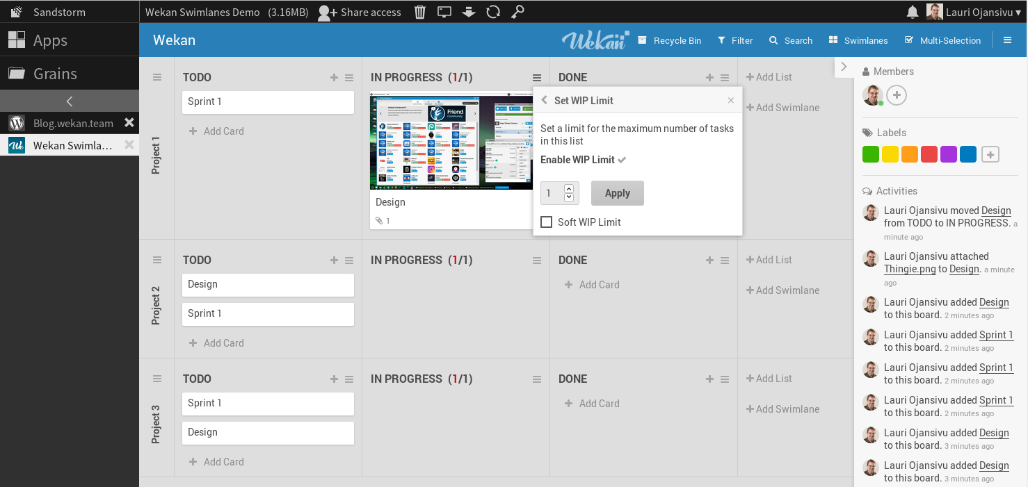 Sandstorm, available in Webbrowser. Wekan in Swimlanes view on Sandstorm